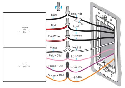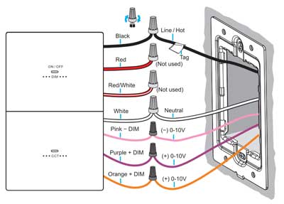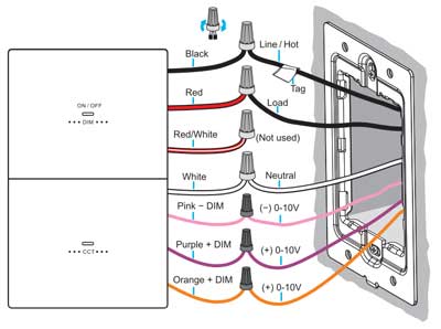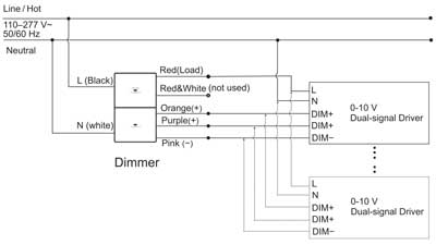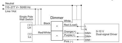 Remarque : Connectez le fil d'alimentation CA (L) du ballast/driver 0-10V au fil de charge (rouge) du variateur.