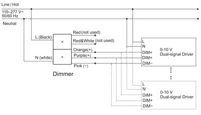 Remarque : Le variateur et le ballast/driver 0-10 V sont connectés indépendamment à l'alimentation secteur (secteur).