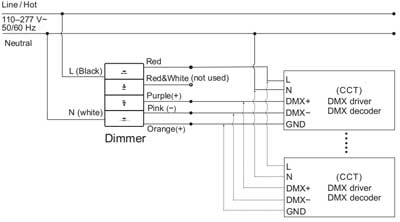 Remarque 2 : connectez le fil d'entrée CA sous tension (L) du pilote DALI au fil de charge du variateur (rouge).