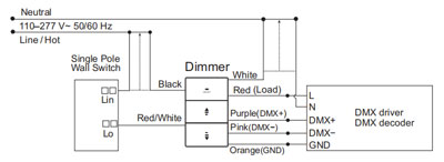 Remarque 2 : connectez le fil d'entrée CA sous tension (L) du pilote DALI au fil de charge du variateur (rouge).