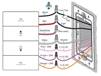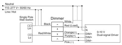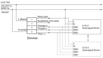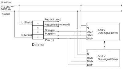 Remarque : Connectez le fil d'alimentation CA (L) du ballast/driver 0-10V au fil de charge (rouge) du variateur.