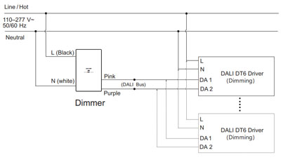 Remarque 2 : Le variateur et le pilote/décodeur DALI sont connectés indépendamment à l'alimentation d'entrée (secteur CA)