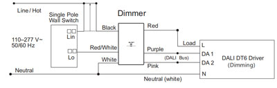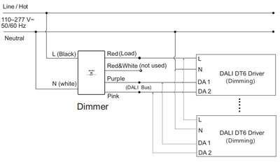 Remarque 2 : connectez le fil d'entrée CA sous tension (L) du pilote DALI au fil de charge du variateur (rouge).